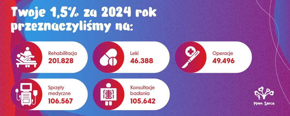 Każdy podopieczny naszej Fundacji jest dla nas najważniejszy, o każdego walczymy do końca mobilizując wszystkie siły. Umożliwia nam to Twoje 1,5%. Dzięki niemu opłacamy operacje, w tym te ratujące życie, sprzęty medyczne, badania, rehabilitację. Pomagamy ośrodkom i placówkom, szukamy ratunku za granicą, dla tych, którzy stracili już nadzieję. Dlatego nie wahaj się, zrób dzisiaj ten mały gest, który znaczy coś wielkiego – uratowane życie kolejnego dziecka!